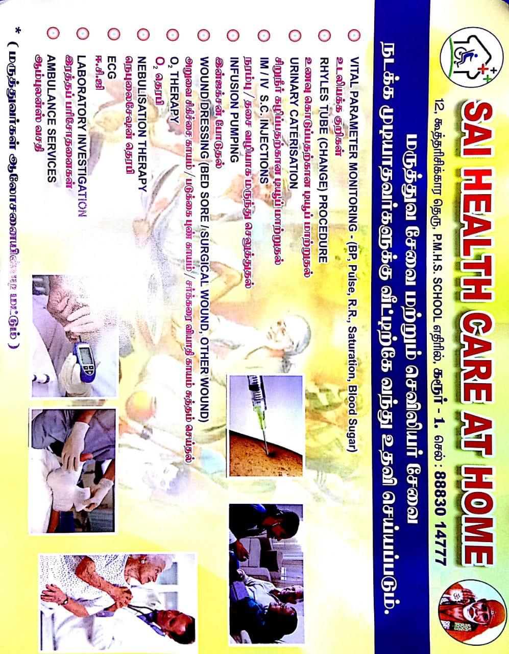 Sai Health Care at Home Home is especially for seniors and meticulously designed to encompass an array of medical services that could be administered at home. Fulfilling the needs of home care nursing in Karur, Sai Health care ensures the distinctive care for elderly at home by the qualified nurses.